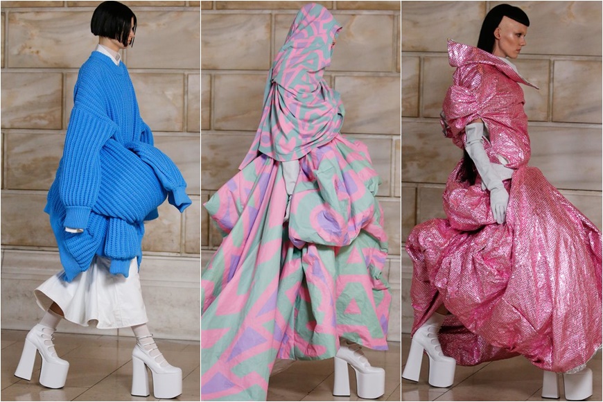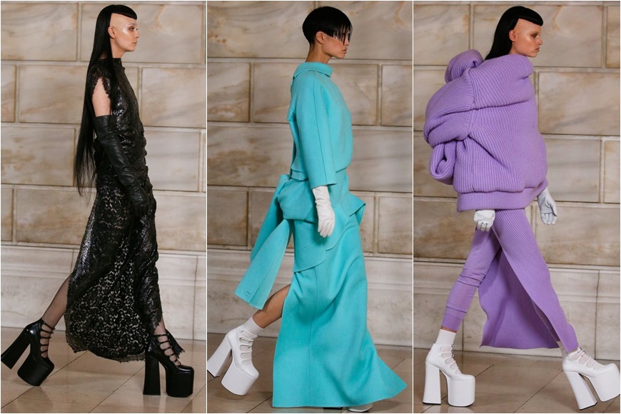 而系列的主題命名為「Choice」,則印證了 Marc Jacobs 堅持自己風格的選擇。從天橋上可見,被放大比例的服裝,像是層次交疊綁起的oversize羅紋針織、空氣感垂墜禮服等。面料運用亦是一大亮點,當中出現像盔甲般的金屬衣、牛仔布料、皮革等多種元素的混搭,塑造出一種游走虛與實的感覺。