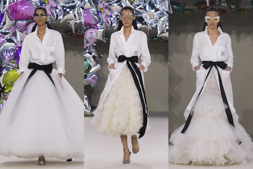Valli 是少有的在高訂設計中,不依賴刺繡而彰顯奢華感的設計師,這也是他的設計為何總能讓人感到活力年輕的原因。在壓軸晚禮服登場前,他更帶來了 6 款純白襯衣配搭薄紗半裙、黑色細腰帶的造型,洗盡鉛華,與繽紛的晚禮服形成鮮明對比,相信這些非傳統高訂風格裙裝,必然會深受年輕人喜愛。