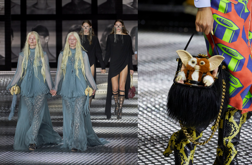 除了服飾,配飾同樣呼應 Y2K 元素,模特兒腳穿橡膠厚底涼鞋、漆面厚底高筒靴和運動鞋,搭配毛茸茸、 logo 裝飾的巨型 tote bag。Peekaboo 手袋以嶄新的面貌演繹了系列的二元對比精神,展露出內裡的結構,亮面皮革拼接淨色帆布;鮮明與柔和色彩碰撞,時而以鍊飾連繫一起。此外,Peekaboo 和 Frist 手袋又以小巧的首飾搭配方式呈現,精緻造型令人眼前一亮。