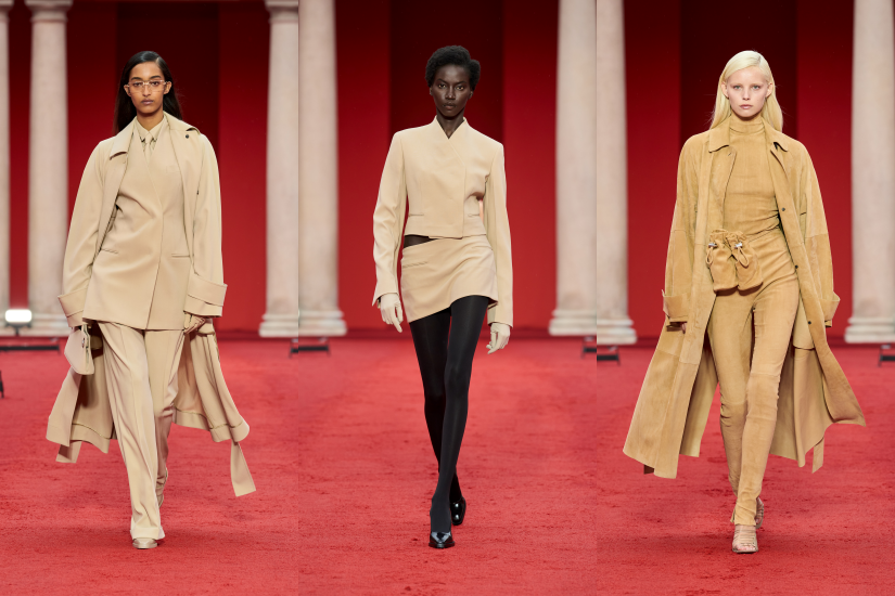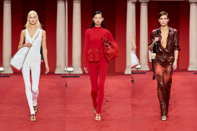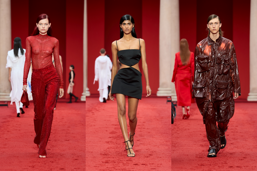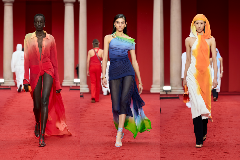全新 Pantone 紅色成為品牌的標誌性色調,這個色調也成為了本季的重點,貫穿於系列之中。此外,也從藝術家 Rachel Harrison 的作品 Sunset Series 中提取色調為顏色漸變的印花和手工染色針織品上色;從光感白色到深靛藍色,從奶油黃色到天藍色,正好呈現出日落和日出的迷人色彩。