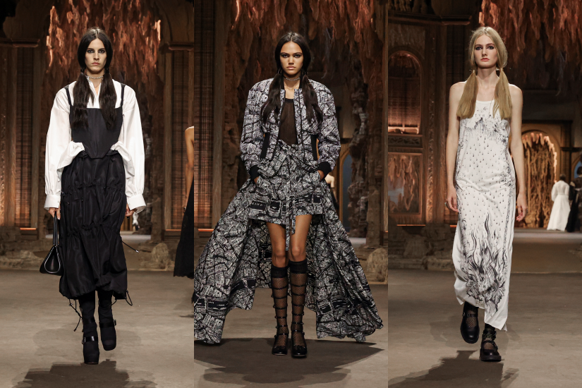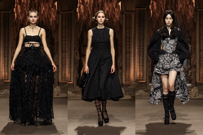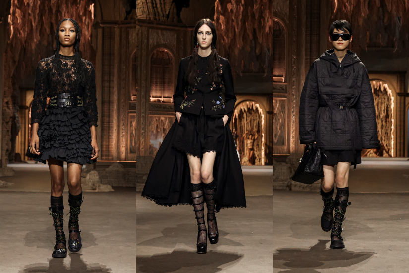 時裝騷選址於杜樂麗花園,場內由法國藝術家 Eva Jospin 製作巴洛克式洞窟為背景。Maria Grazia Chiuri 透過系列開展了一場過去與現在的對話,重新塑造宮廷服飾,新演繹下的緊身胸衣,換上仿幾何的新形態,若隱若現的束腰帶勒出獨特的輪廓,恰似 Catherine de Medici 的寬擺半身裙的造型。