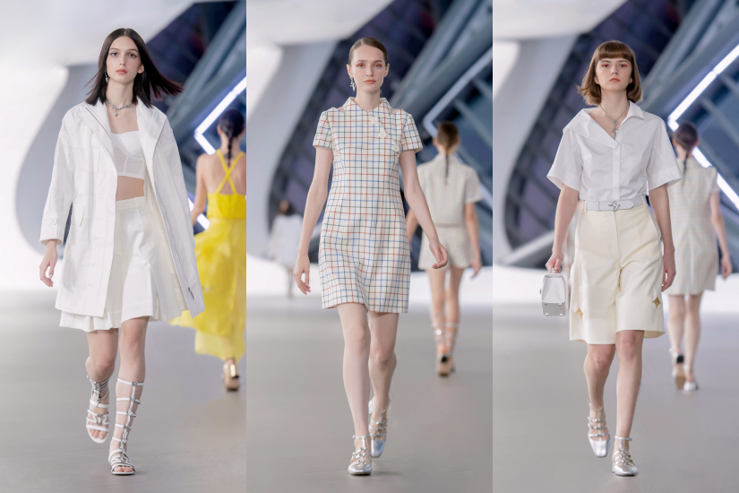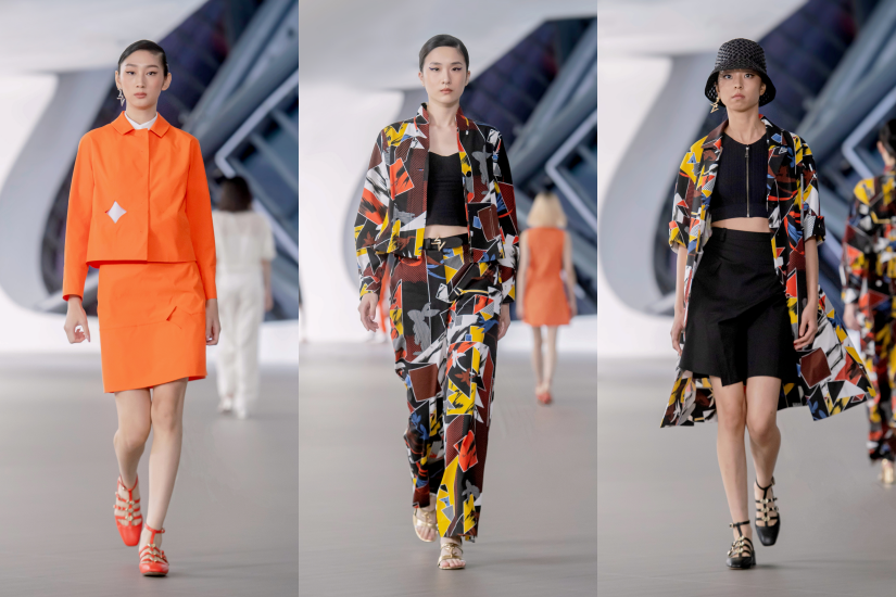 今季以七巧板為靈感作起點,運用三角形、方形、梯形等形狀重新解構詮釋,將幾何圖形拼砌出的奇思妙想建築在時裝之中。呼應設計靈感,用色方面也特別選了「七」個代表色,從亮眼的蜜橙橘、金盞黃,到象徵著春夏活力與歡愉的霽藍與朱砂紅印花,再到經典玄黑與月白色中透出的絲絲翠綠,傳遞出創造力生生不息的堅定能量。
