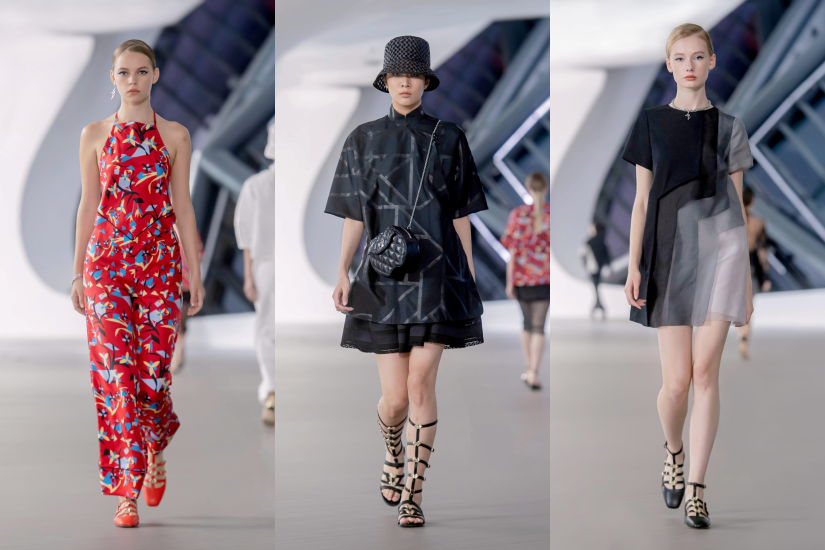 系列的另一焦點是以波普藝術(Pop Art)所打造的印花圖案,鮮明大膽的筆觸重新定義幾何圖形,並融入具東方意象的天堂鳥與蘭花剪影,活靈活現的圖騰印花充滿藝術時尚風格。刺繡向來是品牌最具代表性的工藝,今季以四大名繡中的「蘇繡」活靈活現於系列之中,並以蘇繡中「網繡」的綁紗技法呈現,利用極致的手繡針法於烏干紗上勾勒出幾何圖形的鏤空美學,再與挽繡、打籽繡等相互交織,呈現出細膩立體的花卉圖騰。