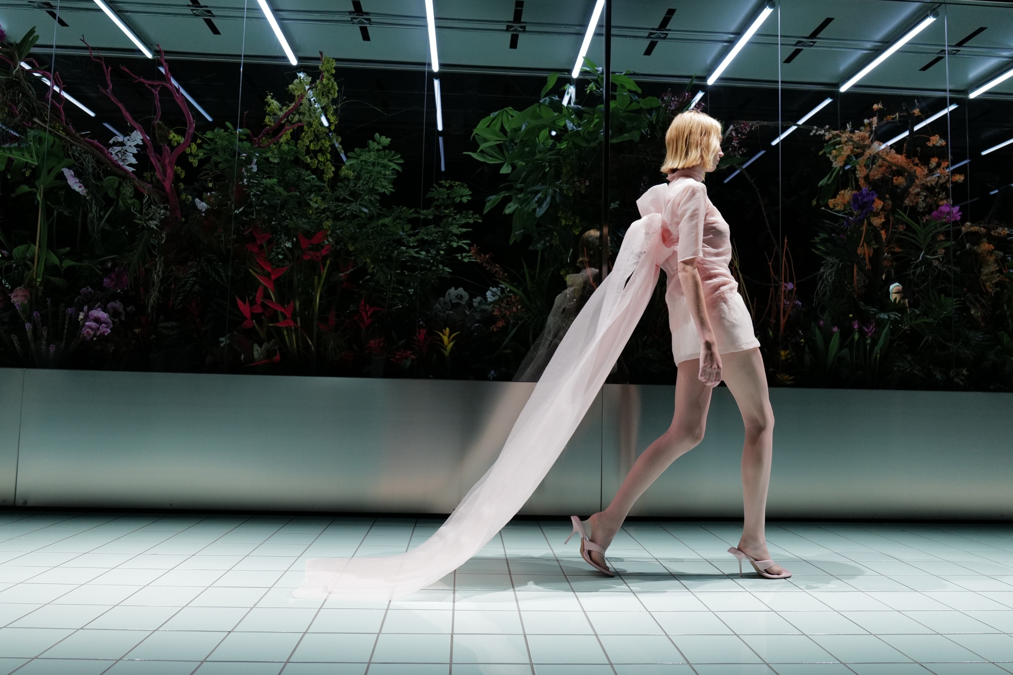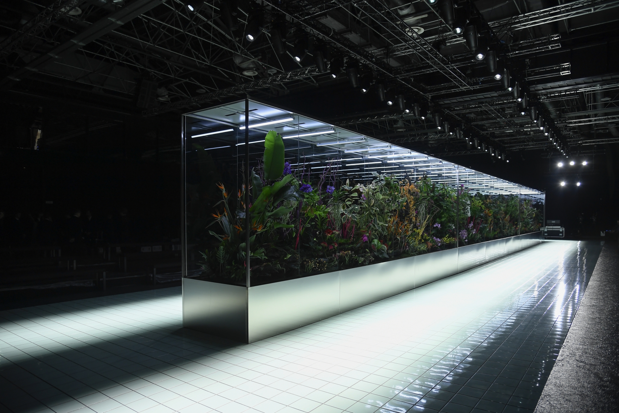 SPORTMAX 這季從場地佈置已經讓人驚喜,中間設置種滿熱帶植物和花卉的巨型透明玻璃櫃,呼應主題並希望大家對「自然變化」(CHANGES IN NATURE) 與「變化本質」(NATURE OF CHANGE)進行反思。