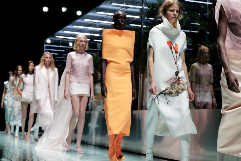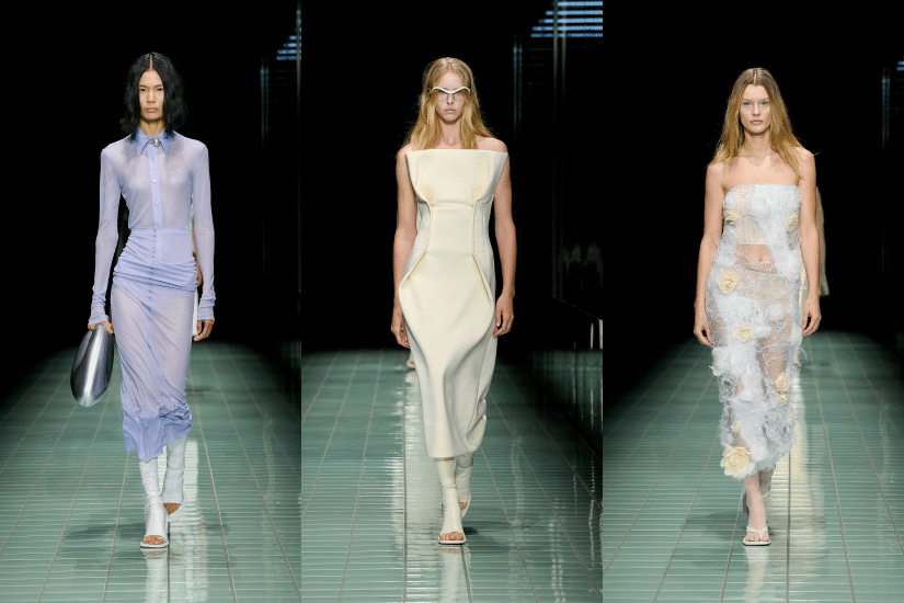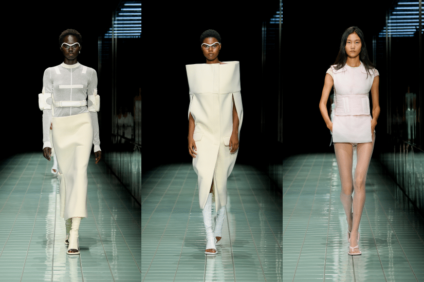 整個系列從輪廓到物料都打破了以往框框,東方美學和各個時代的亞洲風尚中亦成為了本季靈感。模特兒穿上簡約的白色連身裙,佩戴著未來感的眼鏡首先登場。白色成為本季主調,從光學白到香草白,透過深淺不一的白色調呈現豐富多彩的紋理與光影效果,亮色及水系淺色點綴一系列的白色造型其間,為這純粹至上的系列注入活力生機。