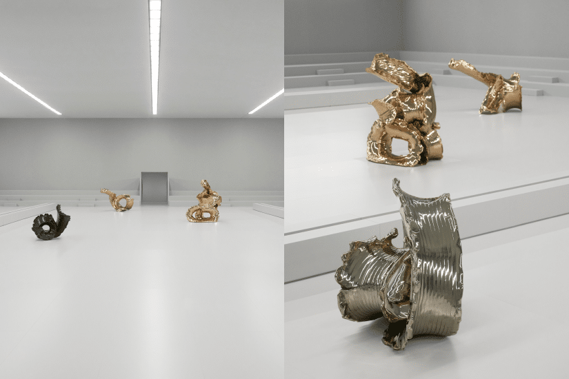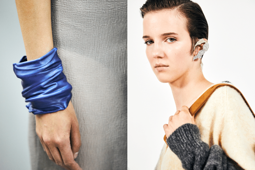 Loewe 這次再度選址巴黎近郊的文森城堡舉辦時裝秀,純白色的空間中擺放了六件大型青銅雕塑,來自再度合作的美國藝術家 Lynda Benglis《Elephant Necklace》的黏土雕塑系列。除了巨型青銅雕塑,她亦參與製作配襯服裝的首飾。Lynda Benglis 自九十年代初開始用黏土創作,並將黏土物料的運用操作比喻為跳舞。將黏土作品放大的過程中,原有的斑點瑕疵及印記亦被放大。雕塑的拋光青銅或啞黑色銅鏽表面反映出不同光線效果,締造流動不息的視覺震撼。