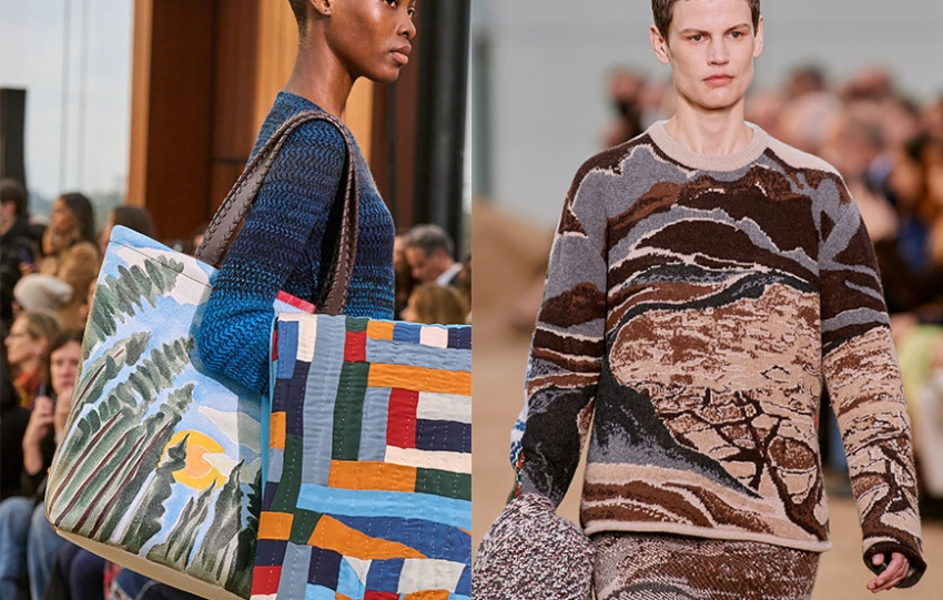 創意總監 Maria Grazia Chiuri 在今次高訂騷也繼續找來了女性藝術家合作,甫進入會場就能看見印度藝術家Rithika Merchant 的畫作《The Flowers We Grew》,經由Chanakya International工坊及工藝學院轉譯為巨幅刺繡作品當作背板。畫作描繪的是一座超現實的花園,孕育著各種奇花異草、奇幻生物,象徵著無邊際的自然與陰性能量。
