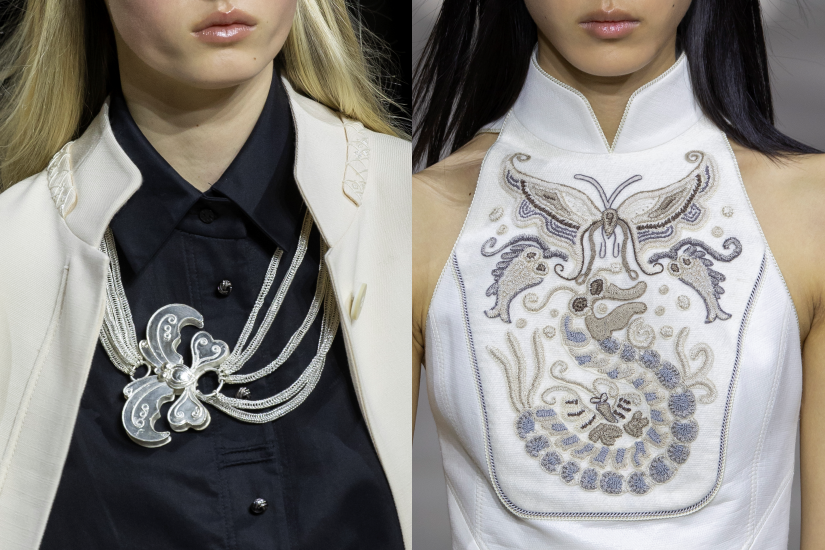 作為品牌核心的刺繡,這季帶來更極致的演繹,特別攜手七位非遺傳承人合作將,將被列為國家級非物質文化遺產的錫繡、堆繡,到立體奢華的雕繡、盤線繡;再到針法創新的辮繡、馬尾繡、破線繡、數紗繡,以及脈絡清晰、靈巧細膩的挽繡與打籽繡,透過層層綻放的細節,化作藝術性的服飾語言,細膩展現女性獨有的情感表達方式。
