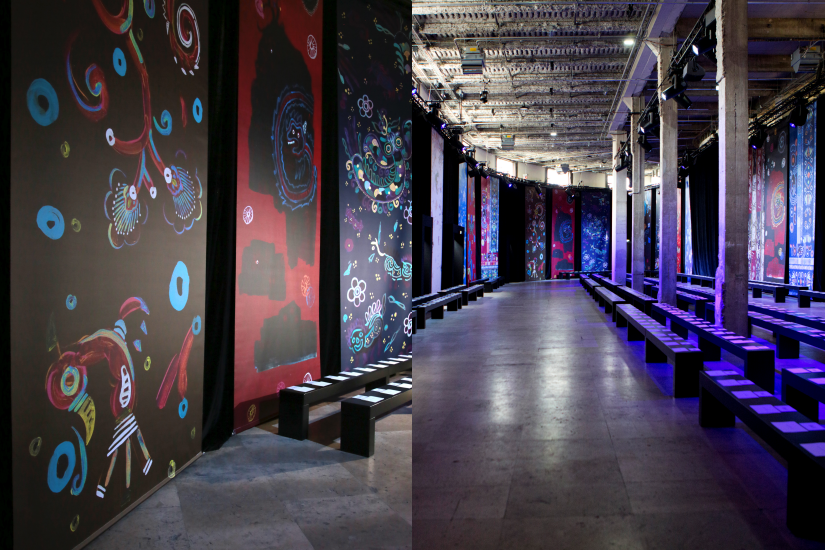 踏進本季的秀場,四周以巨型圖騰畫面環繞,每一幅圖騰皆講述著苗族神話的故事,十種苗族刺繡技法、十種苗繡包款,成為本季磅礡陣仗中最為細膩的精采看點。