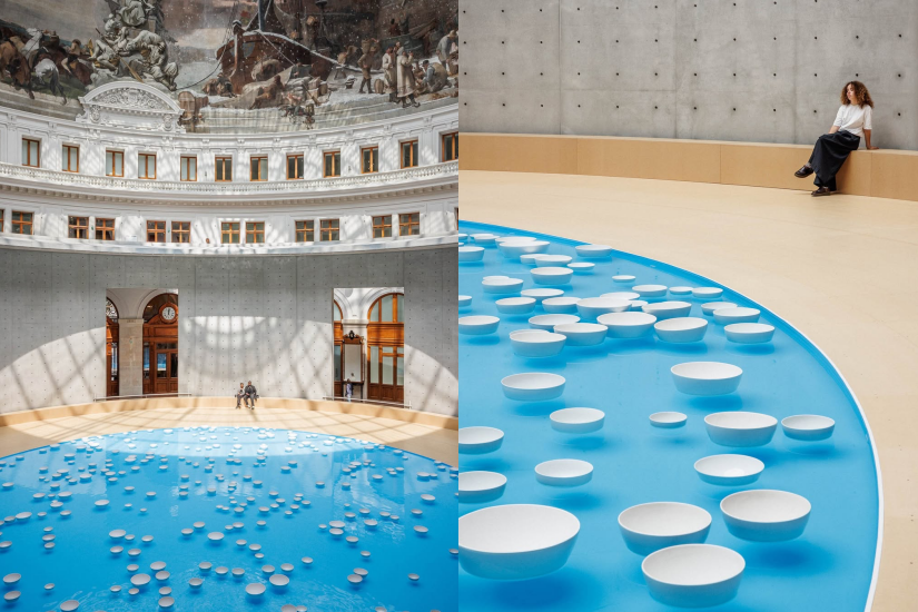 Céleste Boursier-Mougenot 巧妙運用物理原理和聲學效果,讓純白瓷器在水中自由移動,創造出獨特的視覺與聽覺體驗。這些看似隨機的碰撞實則蘊含精密計算,水流速度的控制讓瓷碗的碰撞聲形成一首不斷變化的自然交響曲,在安藤忠雄所設計的圓形大廳之內縈繞,更是相得益彰,讓環境、聲音營造出一場超越時空的對話。