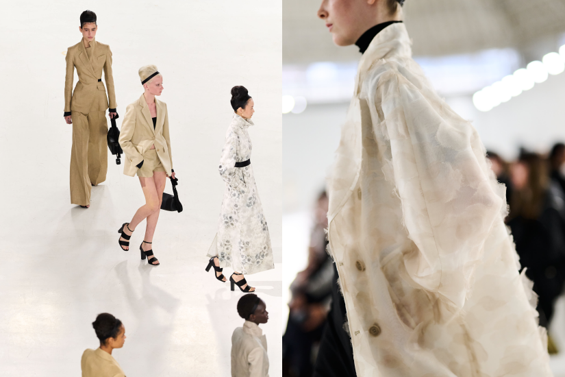 Max Mara 這季設計正是對此呼應——以優雅抵抗平庸,用浪漫挑戰秩序,將女性的獨立與力量注入服裝之中。簡約結構與華麗細節並置,在秩序與自由中創造張力。乾淨俐落的風衣,肩部卻綻開繁複褶疊,像鎏金葉片徐徐舒展;極簡的鉛筆裙因腰臀間浮起的薄紗而有了靈動弧線;而一襲歐根紗裙則由數百片布料剪裁、折疊拼接而成,宛如異域花園中的奇花盛放。