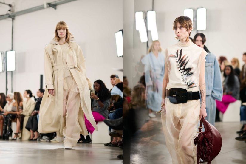「In Lightness & Motion」體現在系列面料與廓形之中。透明歐根紗風衣搭配剪裁俐落的透視長褲,重新演繹經典風衣的重量感;極輕內襯隨步伐流動,增添一抹飄逸。標誌性的雙層羊毛與皮革手套,則為系列奠定堅實基礎,化身可自由配搭、歷久彌新的經典單品。這種在夢幻與實穿之間的平衡,正是 Sportmax 一直以來的語言。