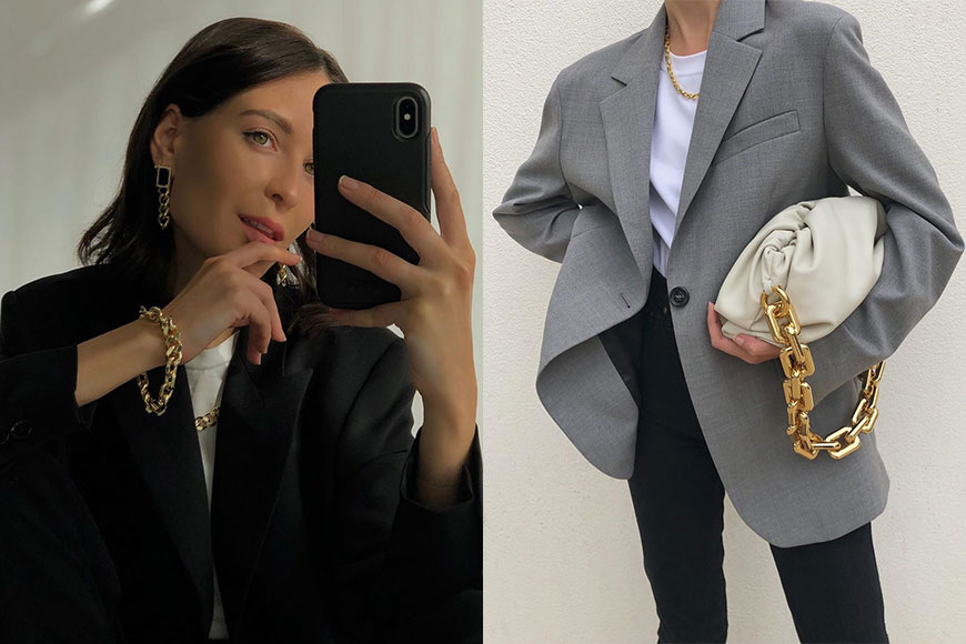 另外 fashionista 也常以白襯衫或西裝套裝配搭,令造型的率性俐落感更為強烈,令造型不落於單調寡悶,更能突顯與別不同的時尚感。不僅如此,你以為與粗獷金鏈格格不入的溫柔風針織衫和復古風雪紡上衣,其實也能互相配襯得到,絕不會有違和感。一條粗金鏈能應用到多個造型,你說說,能有不買的理由嗎?