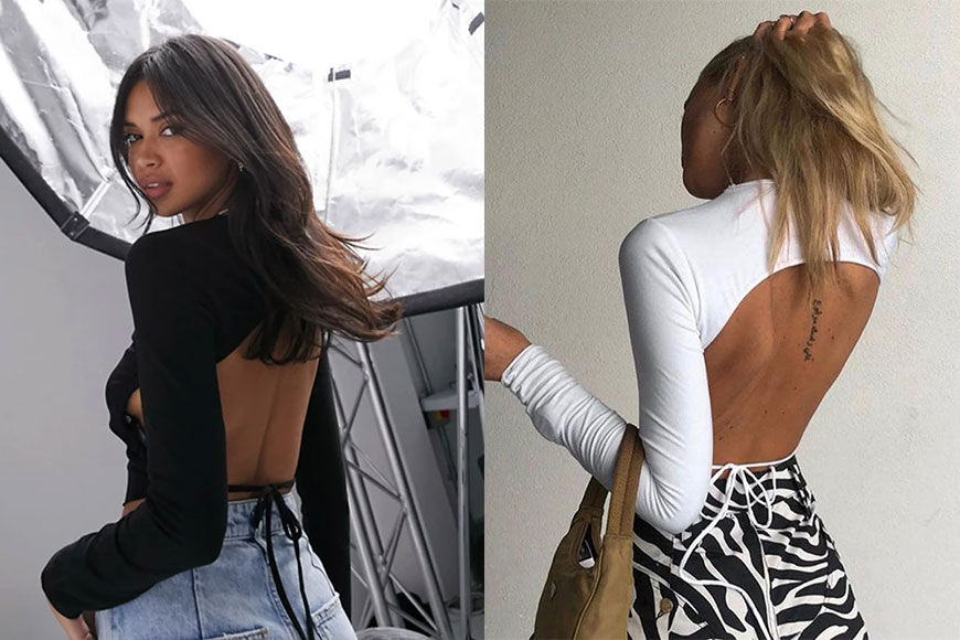 有著不同剪裁和細節的長袖露背上衣也有著不一樣的風格,想達到極致性感氣場的女生,又怎能不選擇緊身的款式呢?盡顯上半身身材曲線的設計,加上原本露背的細節,將嫵媚誘惑的魅力加乘到最大。維持「上窄下闊」的穿搭概念,下身可配以闊腳或喇叭褲腳的褲裝,高腰的 cutting 甚至可以把身材比例修飾得更好。