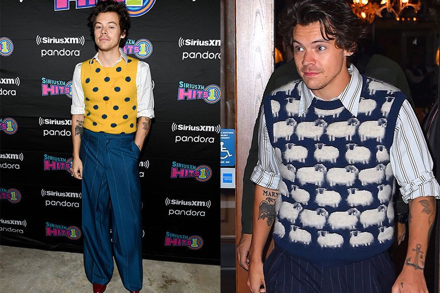 穿上Lanvin綿羊圖案男裝冷背心的Harry,為突顯設計的復古氣息,特意以不同條紋的裇衫及長褲作配搭,一身打扮流露英倫紳士氣質。