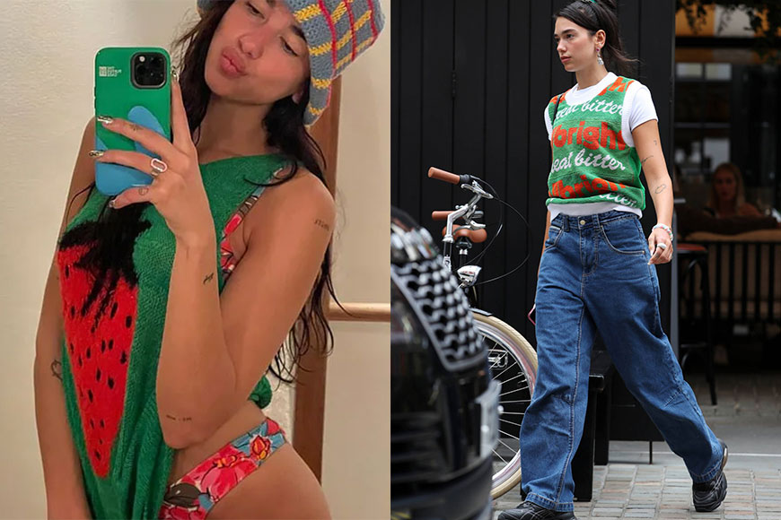 身穿闊身剪裁冷背心的Dua Lipa,選擇在色彩奪目的背心內襯白TE,下身穿搭Baggy Jeans,造型率性隨意。
