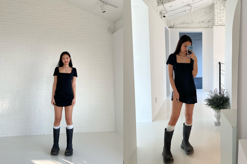 可以參考 BLACKPINK Jennie 的穿搭,黑色連身短裙搭配 Balenciaga Crocs Boot,一身造型顯高又顯瘦,時髦青春。