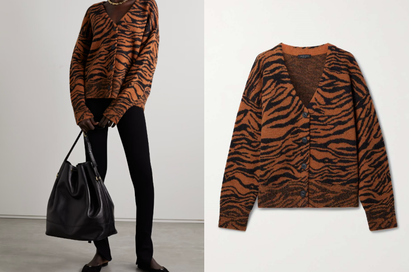 圖案針織外套款式選擇多,經典條子、野性動物圖紋、搶眼撞色等,建議選以淨色服飾作為內搭,避免身上太多焦點。
