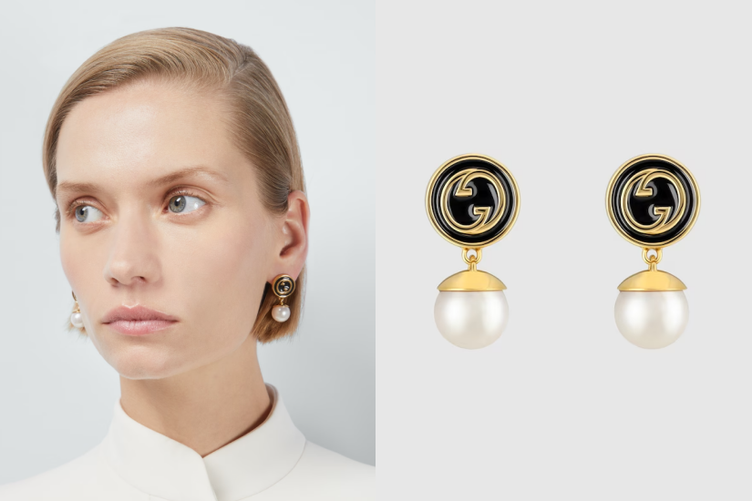 耳環以 Gucci 的標誌性圓形 Interlocking G 為焦點,金色與黑色琺瑯搭配搶眼,塑造出奪目輪廓,並以珍珠細節加以點綴,摩登時尚。