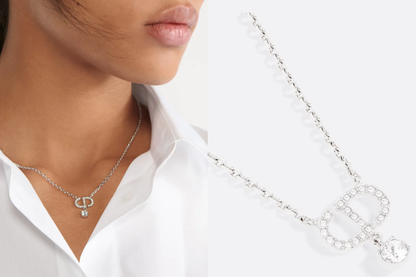 Dior Petit CD 頸鏈的纖幼銀色飾面金屬鏈帶,綴以鋪鑲白色水晶的 CD 標誌,並飾有 1 顆白色水晶,懸垂而下,設計典雅而簡約,不論日常休閒、斯文打扮或約會造型也非常合適。