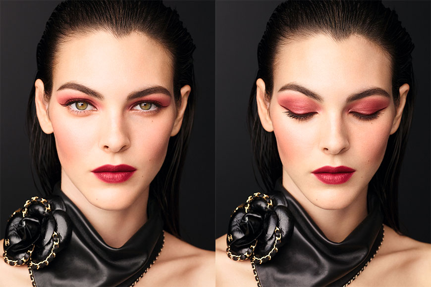 假如你偏好啞緻妝感,便可參考 Chanel 秋季彩妝!Lucia Pica 在秋妝廣告上,為意大利超模 Vittoria Ceretti 設計了一個啞緻卻不失自然感的紅眼妝!雖然並沒有在眼簾加入太多層次色調,只輕輕畫上幼長的貓眼線,以及根根分明的睫毛效果,已經可以把 Vittoria Ceretti 的高冷氣場完美襯托出來。淡雅的霧面眼妝會為你增加帶點復古朦朧美,讓你散發一種有如自帶濾鏡的柔和感。