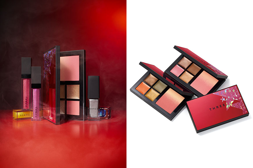 想派對妝感閃而不浮誇,THREE 節日系列的彩妝組合就有極佳的平衡效果。主打橙啡調 #X01 及粉紅色的 #X02,選色極為實用,當中配上兩種閃爍效果較明顯的金屬色,用其點綴眼妝,便可做出低調又不失光感的效果。
