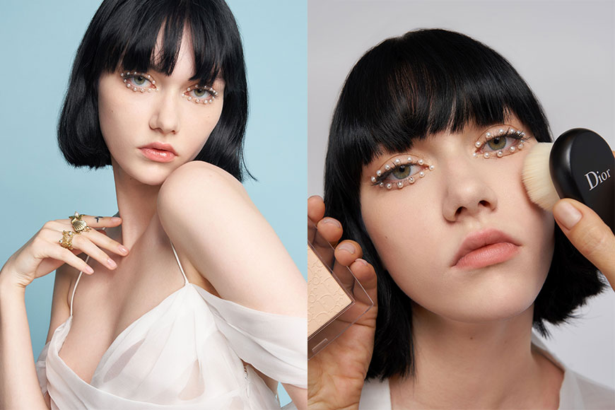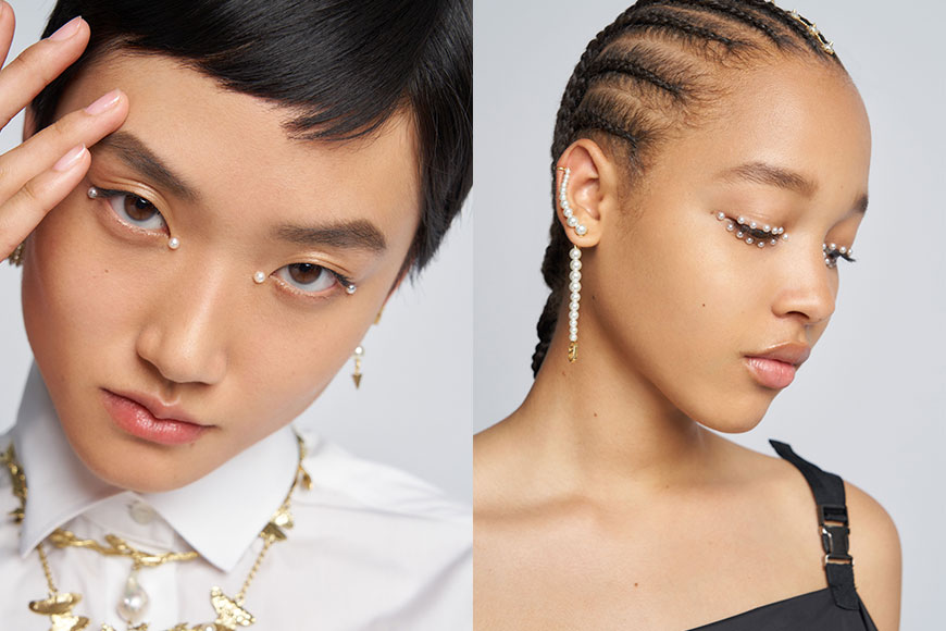 參考 Peter Philips 為 Dior Cruise 創作珍珠妝容,化妝師 Rainbow 在淡薄透紅的素肌底妝上加入珍珠細節,把不同大小的珍珠以雙眼皮膠水牢固於眉下位置,打造一條效果明顯的氣質眼線。此外,你更可在頭髮分界上以同樣方法或髮膠以珍珠點綴,讓整個珍珠妝髮造型更一致。最後,切記挑選珍珠裝飾時,盡量選擇背面為平面的裝飾而非立體的圓珠形,這樣才會有更長效的黏貼效果。
