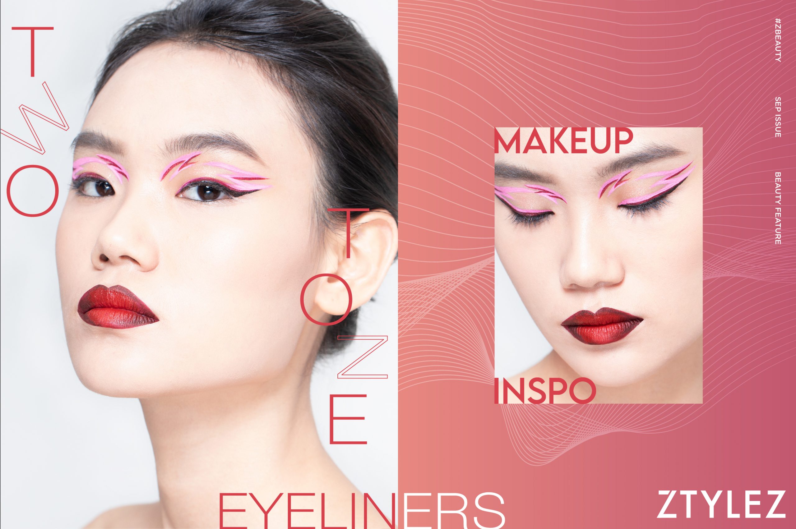 挑戰時尚明星們也愛的創意眼線妝,其實沒有想像中難。參考化妝師示範,你可以先畫一條黑眼線,加深雙眼輪廓之後,再於黑眼線上方分別加上深紅與粉紅眼線。想進一步挑戰,可以於眼簾嘗試勾畫不同的線條,建議先有眼尾位置落筆,再向眼頭位置延伸,而且雙眼線條要盡量對稱,效果更和諧統一。最後,再畫上一個充滿立體感、色調外深內淺的雙色唇妝,讓整個創意妝容更有舞台感!