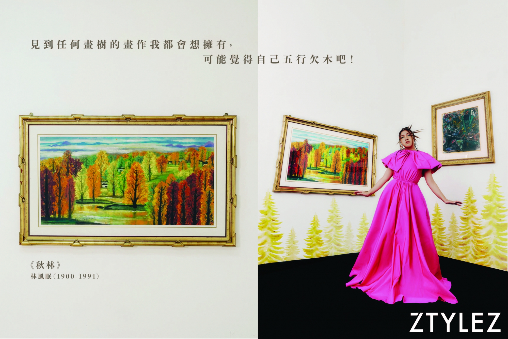夏天的時候我不會開冷氣,很喜歡躺在竹蓆上乘涼,像那些老伯伯一樣,加上一直很喜歡中式家具的質感比較硬和涼涼的感覺,所以最近我購買了一件來自清朝末期的長椅,絕對要推廣中式涼浸浸家具的廣泛性。至於畫作,我喜歡一些具有年代感的,去年買了一幅來自中世紀以樹為題材的畫作,出自一位美國和意大利裔的畫家,其實見到任何樹的畫作我都會希望擁有,可能覺得自己五行欠木吧!」Serrini 站在林風眠作品《秋林》面前駐足欣賞,她自言這一刻的自己很喜歡富有風景題材的畫作,看著就會讓自己心情平伏。此畫作山遠天高,樹樹秋色,一片溫暖燦爛,連倒影都透著暖暖秋意,是林風眠秋景作品中難得如此溫暖明艷的一幅佳作。