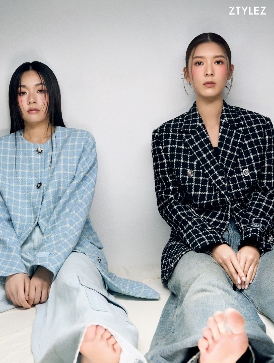 On Jennifer: Black tweed jacket & Washed jeans, Both from Versace