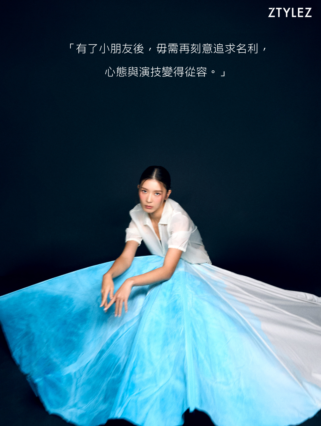 「家庭有了,我就很知足,彷彿最幸福的事物我已擁有了。以前經常思前顧後,受當下的擔心所困擾:深怕若有任何閃失,後續沒有工作機會怎麼辦⋯⋯這份緊張明顯會伸延到演戲,在產後所拍攝的《緣路山旮旯》,大家的評價竟然一致認為我做戲鬆了。有了小朋友後,毋需再刻意追求名利,心態與演技變得從容;亦因為不能用語言跟牙牙學語的子女 connect,意外地打開了我另一種觸覺,在演戲上對情感觸覺更敏銳。」