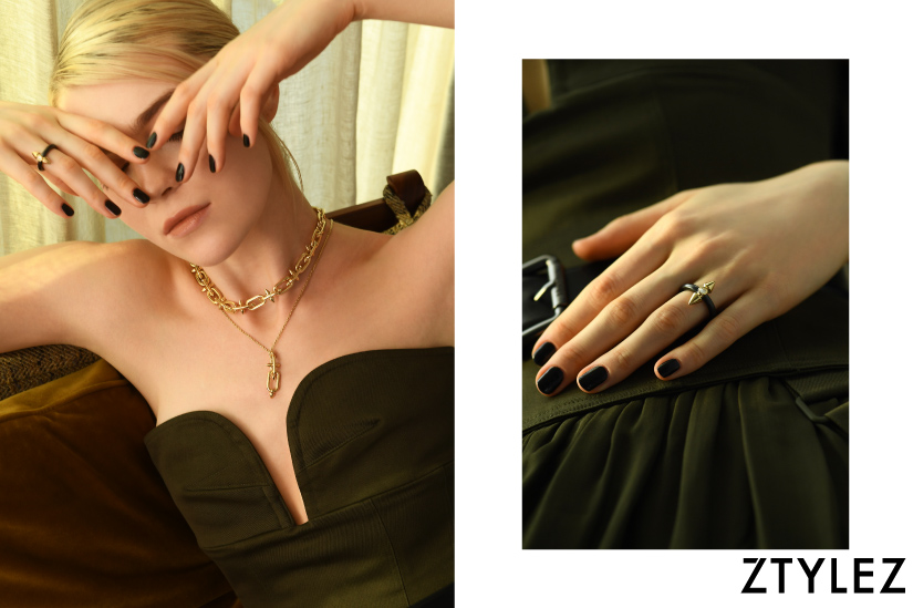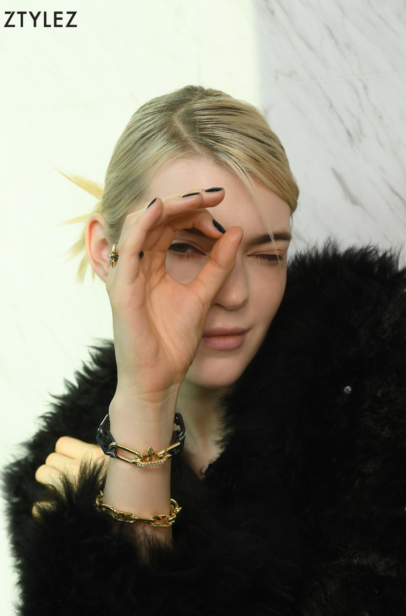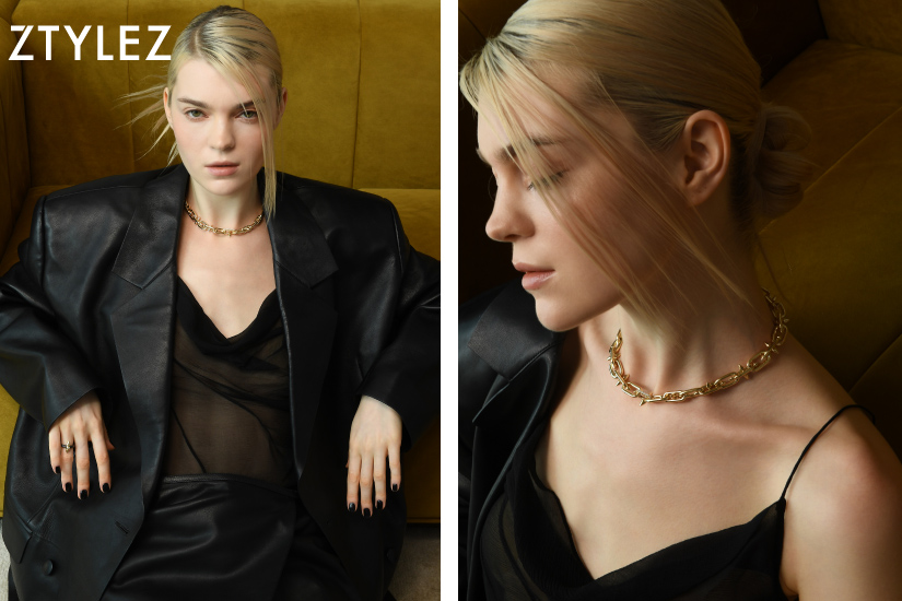 Tiffany Titan by Pharrell Williams medium link clasp necklace in 18k yellow gold with diamonds, Tiffany Titan by Pharrell Williams pendant in 18k yellow gold, Tiffany Titan by Pharrell Williams ring in titanium and 18k yellow gold with a round brilliant diamond All from Tiffany & Co.;Khaki Corset & Dress Both from Max MaraTiffany Titan by Pharrell Williams large link clasp bracelet in titanium and 18k yellow gold with pavé diamonds, Tiffany Titan by Pharrell Williams medium link clasp bracelet in 18k yellow gold with diamonds Both from Tiffany & Co.;Black Fur Jacket from Celine
