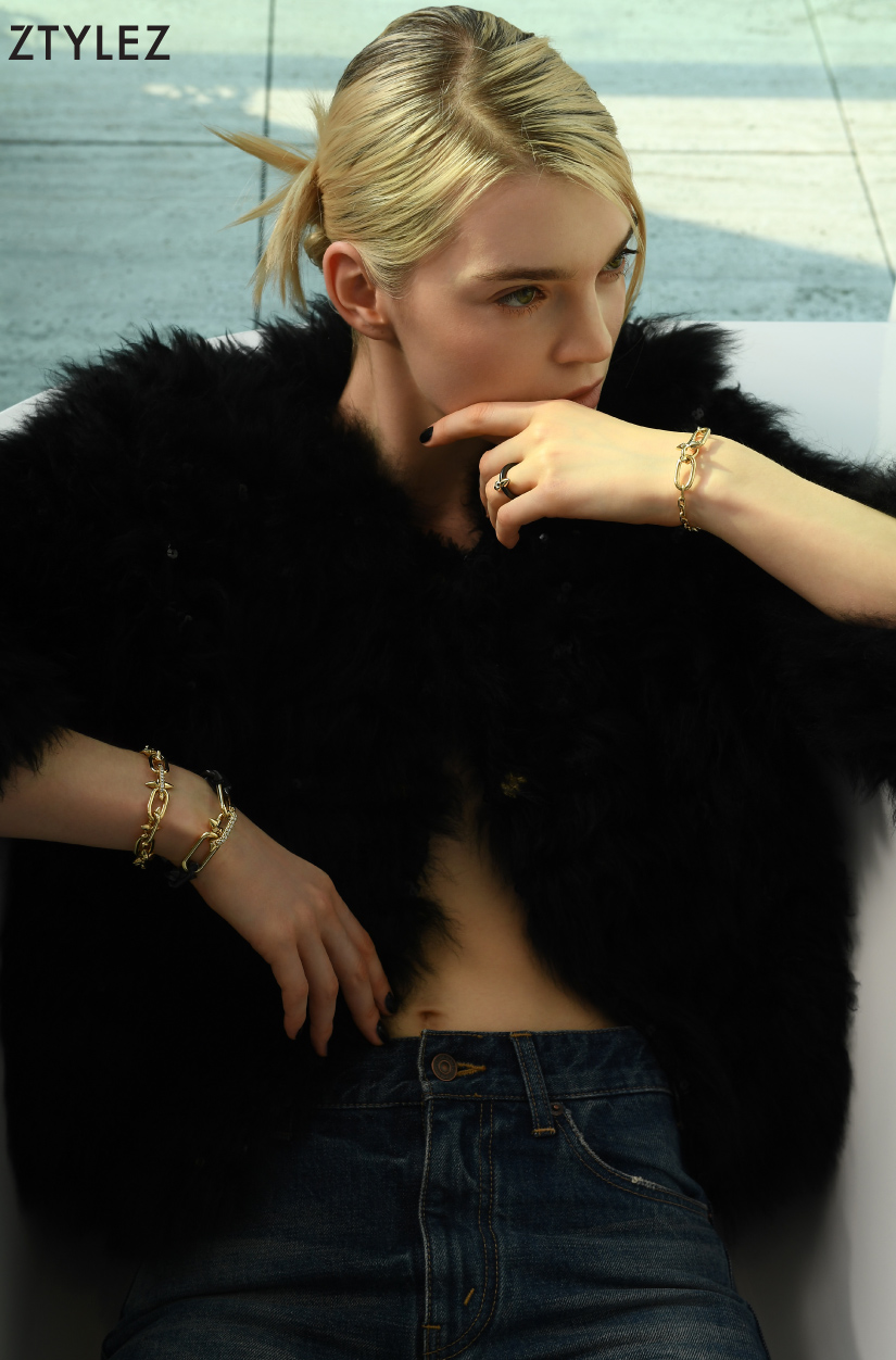 Tiffany Titan by Pharrell Williams medium station link bracelet in 18k yellow gold, Tiffany Titan by Pharrell Williams ring in titanium and 18k yellow gold with a round brilliant diamond Both from Tiffany & Co.;Black Fur Jacket from CelineTiffany Titan by Pharrell Williams large link clasp bracelet in titanium and 18k yellow gold with pavé diamonds, Tiffany Titan by Pharrell Williams medium link clasp bracelet in 18k yellow gold with diamonds Both from Tiffany & Co.;Black Fur Jacket from CelineTiffany Titan by Pharrell Williams medium station link bracelet in 18k yellow gold, Tiffany Titan by Pharrell Williams ring in titanium and 18k yellow gold with a round brilliant diamond Both from Tiffany & Co., Tiffany Titan by Pharrell Williams large link clasp bracelet in titanium and 18k yellow gold with pavé diamonds, Tiffany Titan by Pharrell Williams medium link clasp bracelet in 18k yellow gold with diamonds All from Tiffany & Co. ;Black Fur Jacket & Jeans Both from Celine