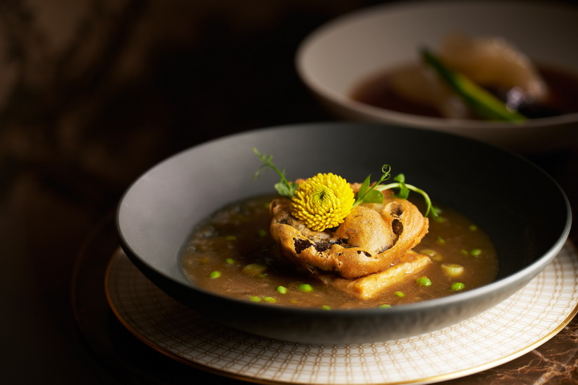 晚宴菜單匯聚兩位大師的經典手筆,包括「潮汕龍蝦飯配炸蝦多士」,將潮汕傳統「魚飯」升華為奢華龍蝦版;還有「古法龍穿虎肚」,以冷燻台灣白鱔與蝦肉釀入豬大腸,再經滷製、風乾與淋炸,展現潮菜「食不厭精」的極致工藝。曾師傅則以「蒜香花姿釀龍蝦鉗」突顯港式避風塘風味,並帶來經典粵菜「頂湯燉鳳吞海中寶」,以手工去骨乳鴿釀入鮑魚、遼參、花膠及鮮蟹肉,燉出濃郁精華。