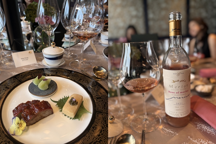 Wine Pairing Set 以三道精緻前菜拉開序幕,包括文華廳招牌菜式蜜味西班牙黑豚肉叉燒、梅子青筍及黑魚籽金磚豆腐。龍眼蜜的香甜與豆腐的酥脆,搭配 2021 年來自日本長野 ( EstateGoichi )的梅洛粉紅葡萄酒相得益彰。這款比較乾身的粉紅葡萄酒帶有清晰的玫瑰色澤,充滿士多啤梨和車厘子的果香,與黑豚肉叉燒及黑魚籽金磚豆腐的濃郁風味特別搭配。Estate Goichi 由林剛一 ( Goichi Hayashi ) 於 1951 年創立,是長野縣歷史最悠久、規模最大的酒莊之一,其葡萄園位於長野縣的桔梗原地區,採用老藤梅洛葡萄釀造,傳承 70餘年的精湛工藝。