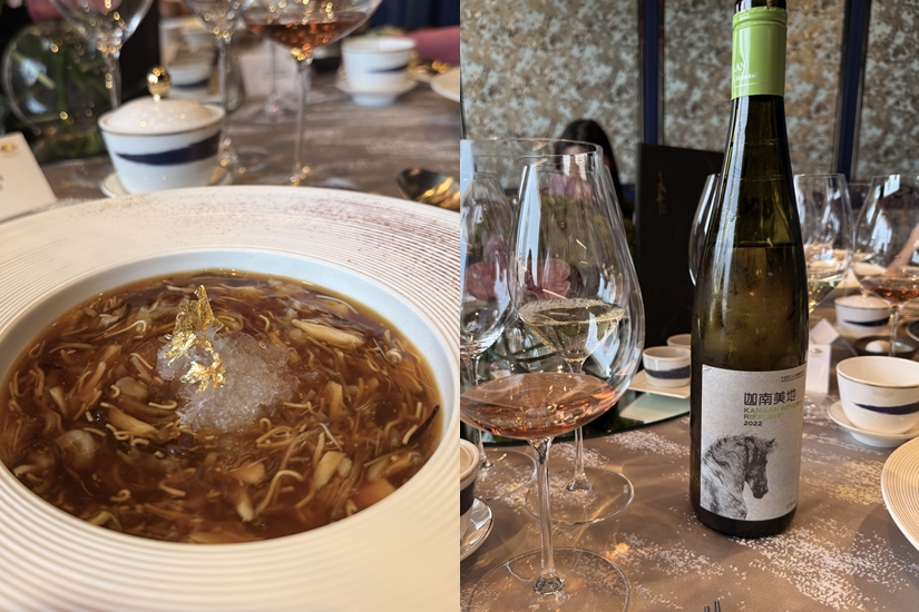 下一道菜是酸辣海皇燴官燕。燕窩被譽為粵菜中的珍品,曾是皇室御膳的象徵。廚師選用蟹肉、帶子和大蝦等多種海鮮為點綴熬製上湯燉煮超過 4 小時,湯味濃郁。賓客亦可選擇三蒜銀絲蒸龍蝦或蠔皇原隻廿三頭南非吉品鮑魚(此道菜需額外附加港幣800 元)。龍蝦以三種蒜香調味,其中黑蒜的獨特風味為龍蝦與粉絲增添了層次感,口感鮮爽豐富。侍酒師建議此道菜可以搭配來自寧夏賀蘭山的迦南美地 Riesling (2022 年)。迦南美地酒莊由創始人王方於 2011 年創立,以其標誌性的 「小馬」 系列和優質 Riesling 聞名,為中國葡萄酒在世界舞台上贏得了重要地位。