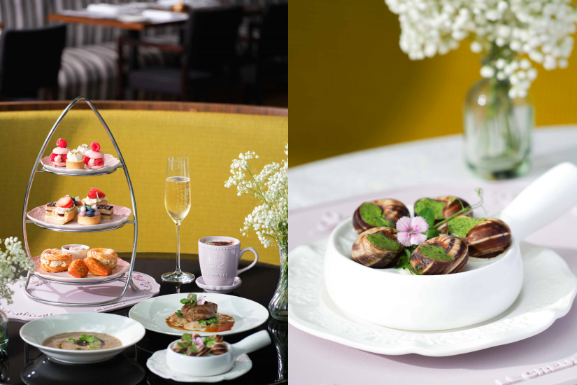 整個下午茶由香草法式焗田螺揭開序幕,濃郁牛油香氣與香草清新氣息交織,開啟法式味覺之旅。主菜三選一,包括安格斯牛柳配酸菜及波爾多紅酒汁、牛油浸盲鰽魚柳配法式海鮮汁,或傳統油封鴨腿絲配芝士長通粉,各款食材均用心烹調,展現經典法國餐飲文化。下午茶定價由每位港幣 $388 起,週末及公眾假期每位港幣 $438 起,亦可升級至組合價,尊享 Le Creuset 精美陶瓷杯一隻。