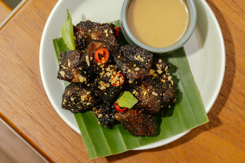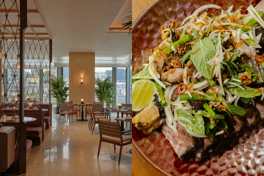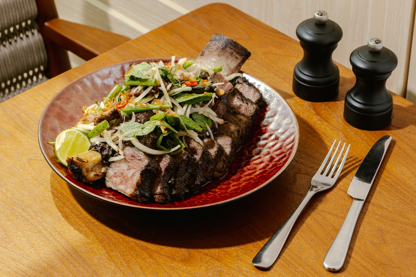 主菜方面有多款適合多人分享的菜式。越式風味牛肋骨整條上桌,牛肉以八角及肉桂等香料慢煮至軟腍,肉味濃厚,再配香草洋蔥沙律平衡油脂感,每份港幣888元。
