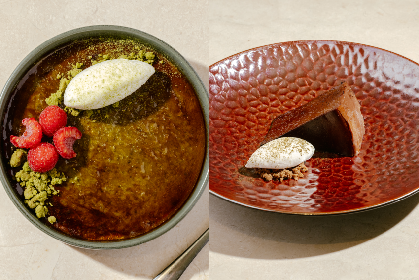 甜品方面亦有特色選擇,例如抹茶焦糖燉蛋。甜品頂層為焦糖薄脆片,下層是幼滑抹茶燉蛋,入口帶抹茶微苦與焦糖甜味,每份港幣98元。