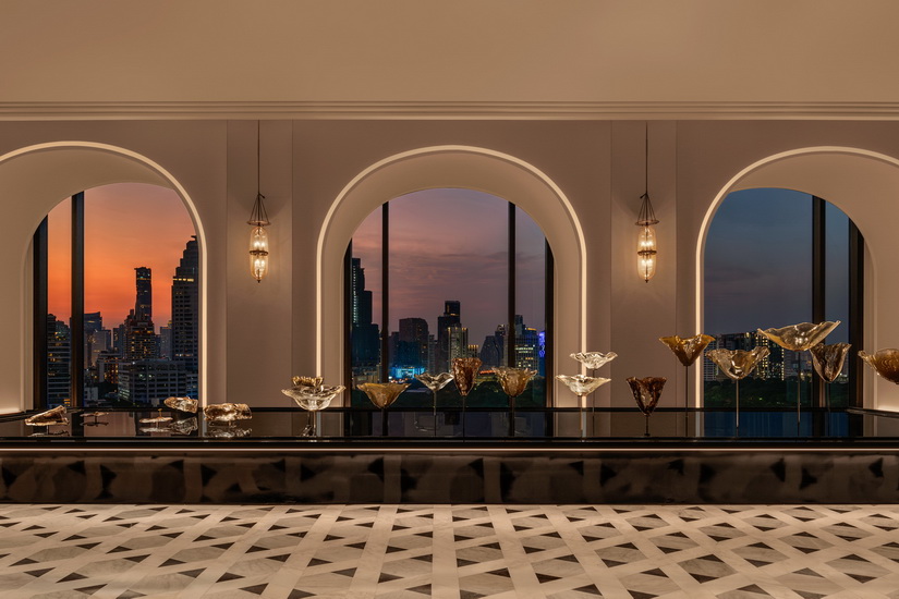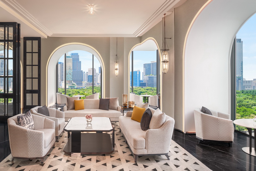 酒店由國際建築大師 SOM 和泰國 A49 聯手打造,建築外觀以層層遞升的露天平台為特色,俯瞰曼谷天際線和公園美景。內部設計則由泰國著名設計公司 PIA 完成,空間展現出時尚典雅和現代氣息,靈感源於「兩個文明的交匯」。從經典的泰國藝術到國際設計美學,每一處細節均體現文化融合的精髓。